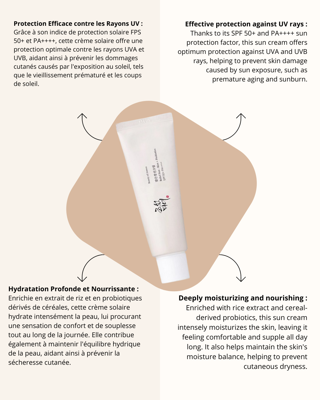 Beauty of Joseon's "Relief Sun" organic sun cream offers effective protection against UVA and UVB rays thanks to its SPF 50+ sun protection factor PA++++. Its light, non-sticky formula is quickly absorbed by the skin, leaving no white marks. Enriched with niacinamide, rice extract and probiotics derived from cereals, this cream soothes, moisturises and nourishes the skin, leaving it radiant and supple. Designed without oxybenzone, octinoxate or ingredients of animal origin, it is ideal for sensitive skin.