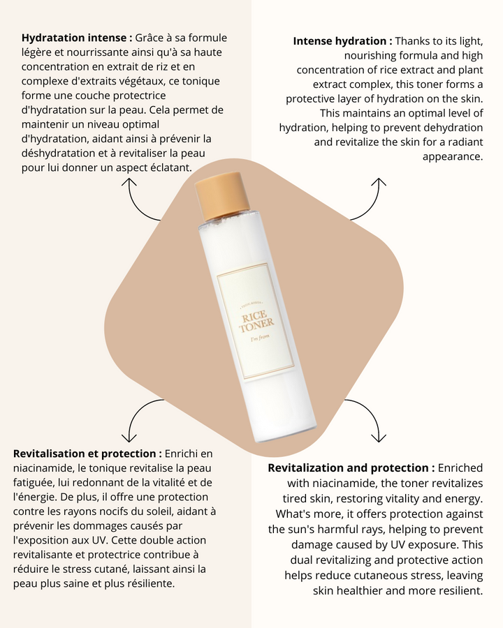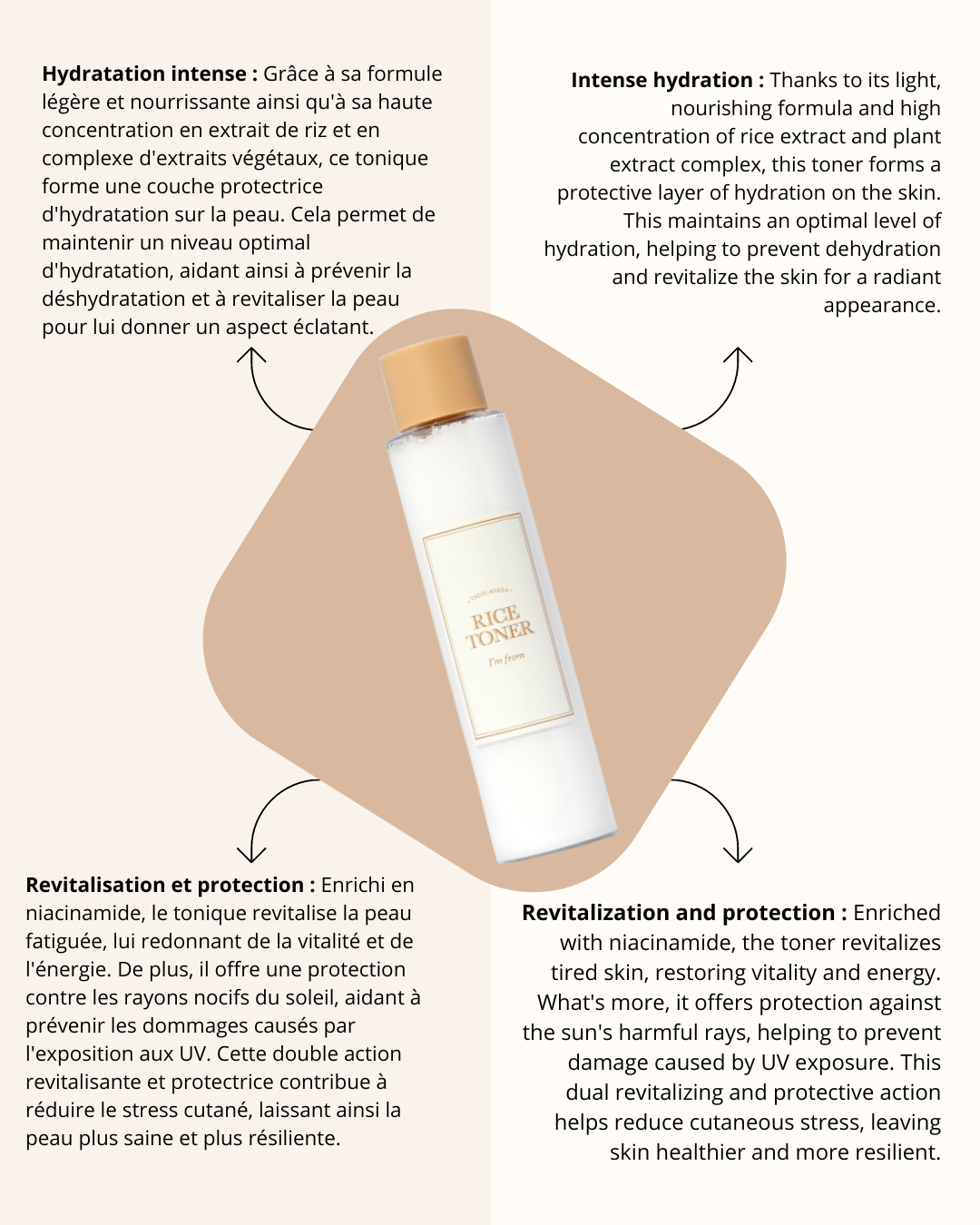I'm From Rice Toner is a revolutionary Korean essence that reinvents skincare rituals. Formulated with 77.78% Goami rice extract and a complex of plant extracts, this toner soothes dead skin cells and forms a protective layer of moisture. Enriched with niacinamide, it revitalizes tired skin, protects it from the sun's harmful rays and reduces cutaneous stress. Its light, nourishing formula provides intense hydration, leaving skin radiant and revitalized. Vegan formula.
