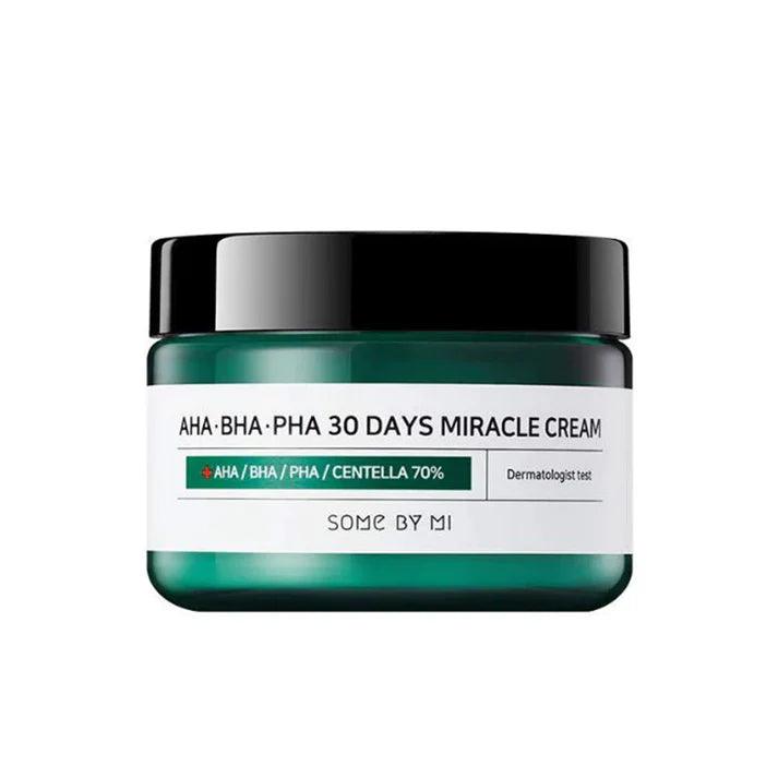 Some By Mi AHA∙BHA∙PHA 30 Days Miracle Cream is a revolutionary solution for radiant, glowing skin in just 30 days. Enriched with powerful natural extracts such as Centella Asiatica, Tea Tree and a combination of AHA, BHA and PHA acids, this cream works deep down to eliminate blemishes, regulate sebum production and strengthen the skin barrier. Its gentle formula is suitable for all skin types, even the most sensitive, and offers visible results from the very first applications.